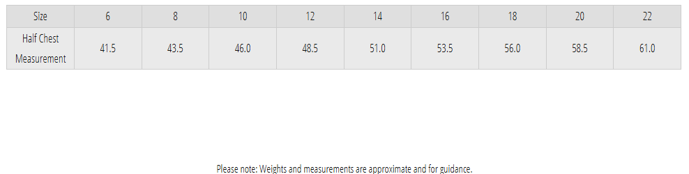 | Width (half chest cm) | 46.5 | 49 | 51.5 | 54 | 56.5 | 59 | 62 | 65 | 68 |